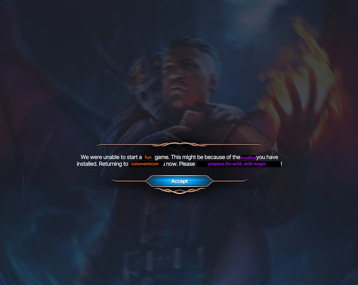 No support is offered or guaranteed for anyone who modifies the behavior or contents of Listonomicon. It is already difficult to keep up with new mods daily on the Nexus; updates and changes to mods in the list; changes in the script extender; new and changed features in the community compatibility frameworks; as well as game patches and hotfixes; vanilla game bugs; and the consequences of (seemingly) minor mod setting tweaks on gameplay. Further modify the list at your own peril. We hope that you are able to customize a fun, stable, great experience tailored to your specific tastes using Listonomicon as a stepping stone - but will not offer troubleshooting or technical support. There is a number of "Optional" mods included in Listo for players who want certain QoL or challenge features where we will try to help, but do not endorse that the end result will be balanced or fun or sane! If you are customizing the list and trying to play multiplayer, please be aware that your mod list, including the exact order mods are in, MUST be the same as all COOP friends. Otherwise MP will break. In fact many things break BG3 MP so you will need to do a lot of troubleshooting.